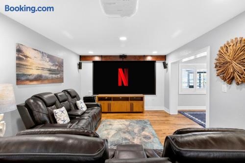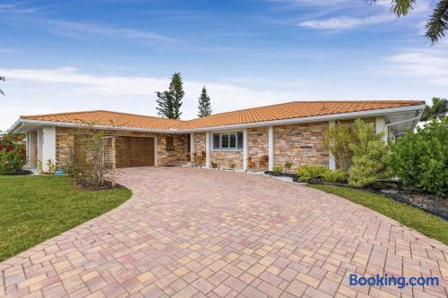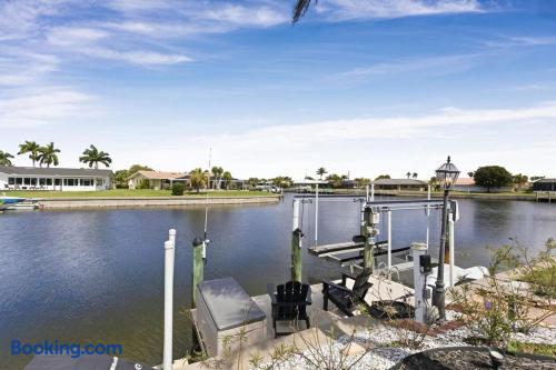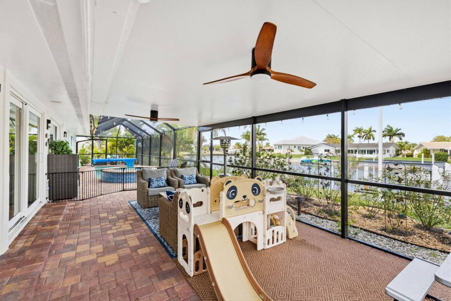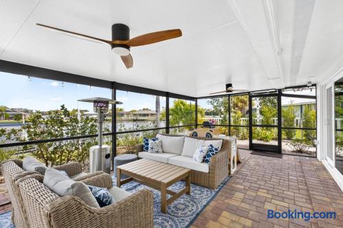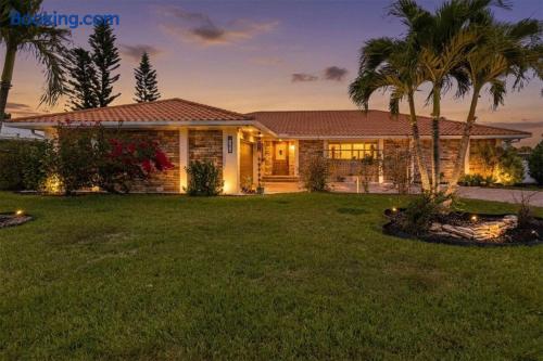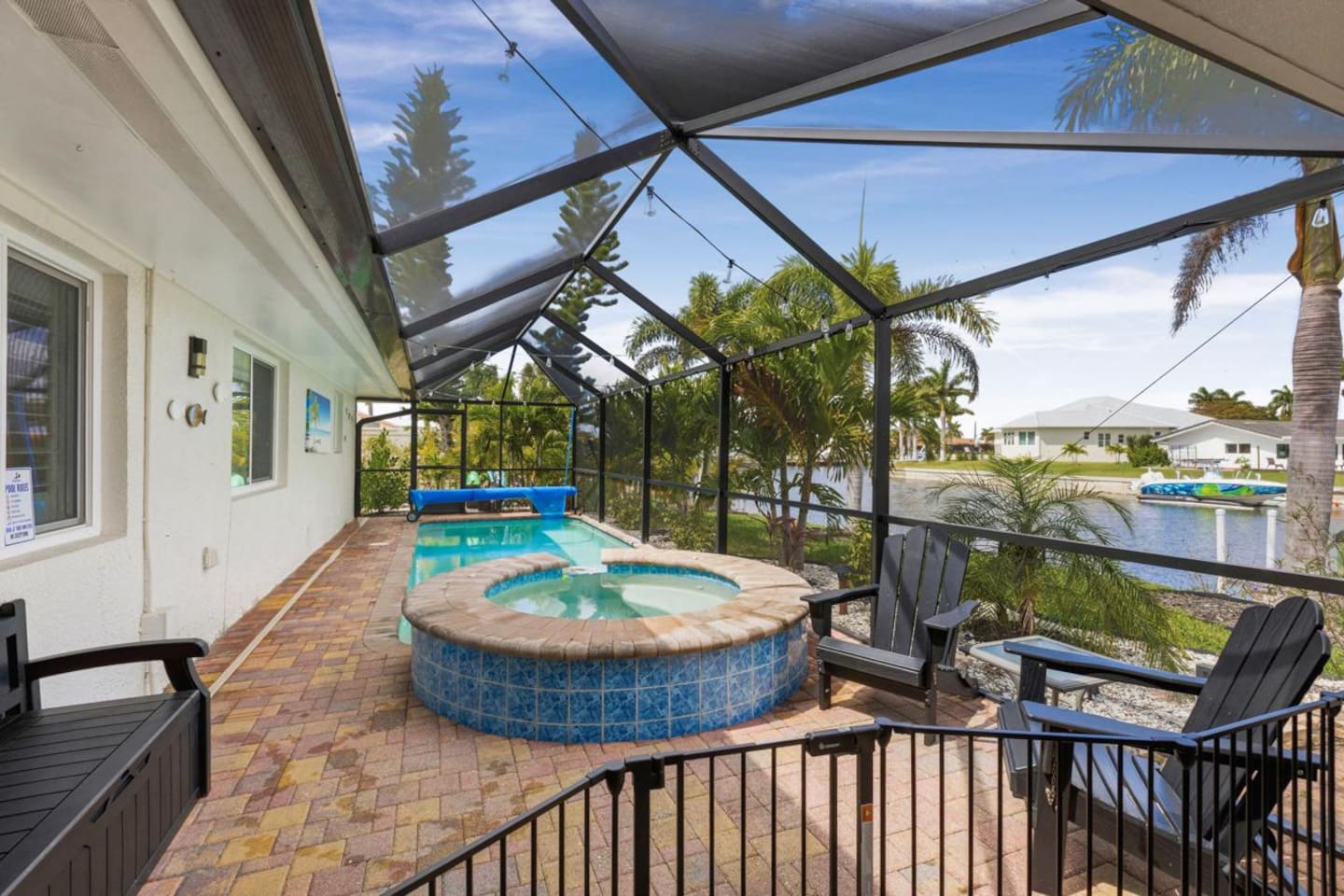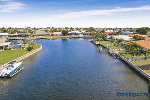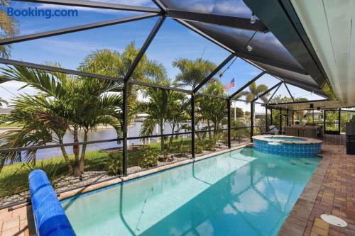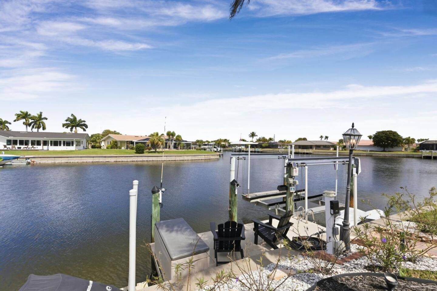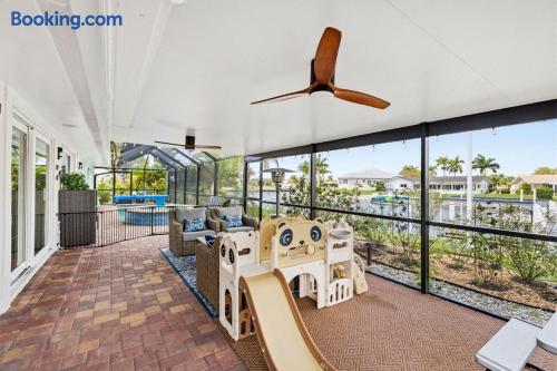Welcome to Casa del Canal, a luxury waterfront retreat in Punta Gorda Isles with a private dock, 10000 lb boat lift, heated saltwater pool, spillover spa, and direct Gulf access with no fixed bridges. Perfect for boaters, anglers, families, and small groups, this spacious home sleeps up to 9 guests with 3 bedrooms and 3 full bathrooms. Enjoy peaceful canal views, a screened lanai, and the kind of indoor-outdoor living that makes Florida stays unforgettable. Why guests love Casa del Canal Private concrete dock with 10000 lb boat lift No bridge access to the Gulf Heated saltwater pool and attached spillover spa Screened lanai with lounge seating and outdoor dining Gas grill for easy dinners at home Private home theater with reclining leather massage seats Chef’s kitchen with quartz island Smart TVs throughout the home High-speed WiFi Minutes to downtown Punta Gorda and Fishermens Village Close to Punta Gorda Airport The space The outdoor area is the highlight of the home. Spend your days boating, fishing, swimming, soaking in the spa, or relaxing on the lanai overlooking the canal. The private dock and no-bridge Gulf access make this a rare find in Punta Gorda Isles. Inside, the home is bright, open, and comfortable with stylish finishes and plenty of room to gather. The kitchen is fully equipped with quartz countertops, a large island, JennAir stove, Samsung Bespoke refrigerator, and Ninja coffee maker. When it’s time to wind down, enjoy movie night in the private theater with a 100-inch screen and plush reclining leather massage seats. Sleeping arrangements Primary suite: King bed, canal views, lanai access, sitting area, en suite bath Second bedroom: King bed, private en suite bath Bunk room: Two full-over-full bunk beds Location Casa del Canal is located in Punta Gorda Isles, just minutes from downtown Punta Gorda, Fishermens Village, waterfront restaurants, shopping, and local attractions. It is also just minutes from Punta Gorda Airport, making arrival and departure easy. Whether you are planning a boating trip, fishing getaway, family vacation, or relaxing waterfront escape, Casa del Canal offers a standout stay in one of Punta Gorda’s most desirable locations.